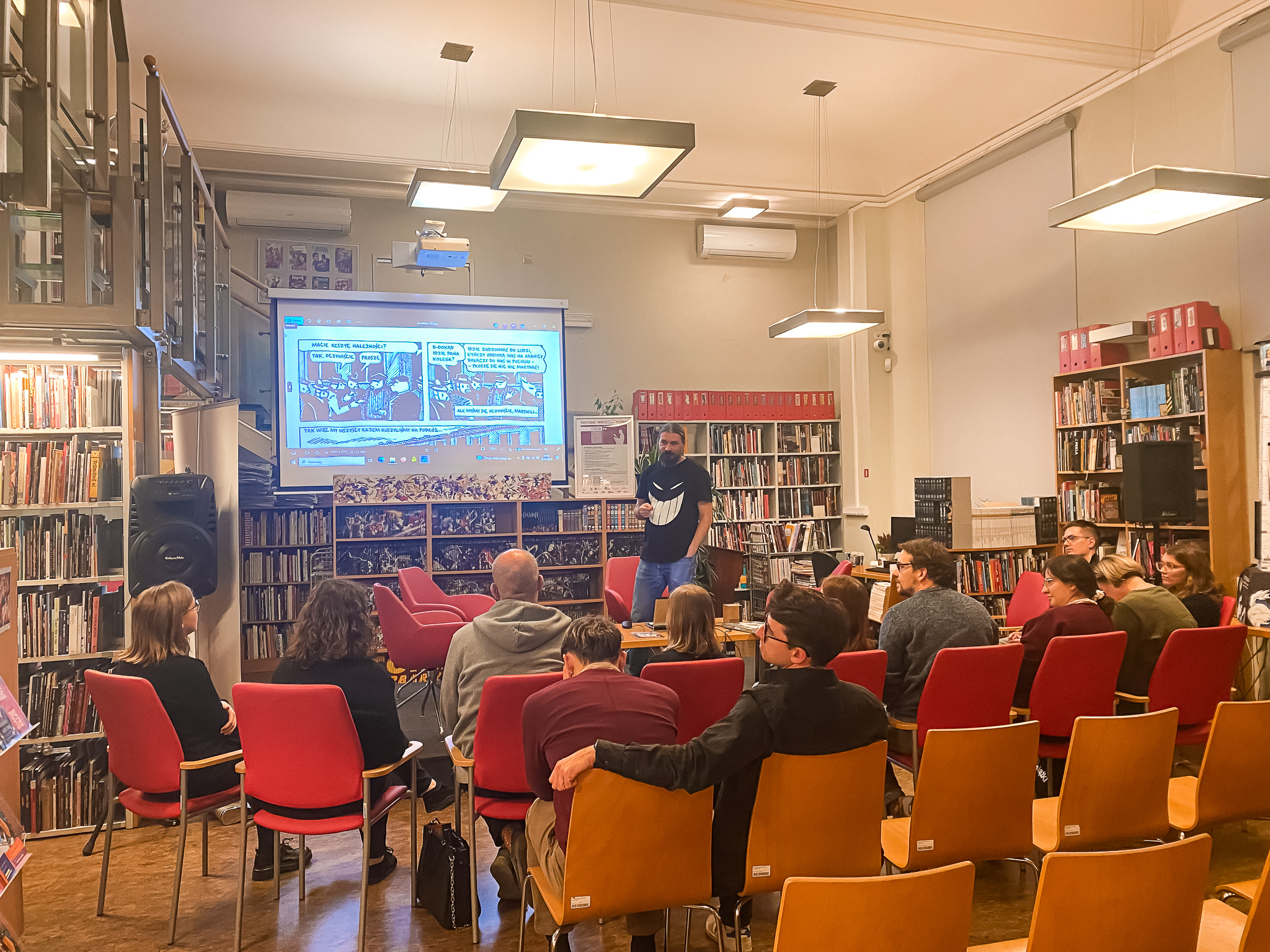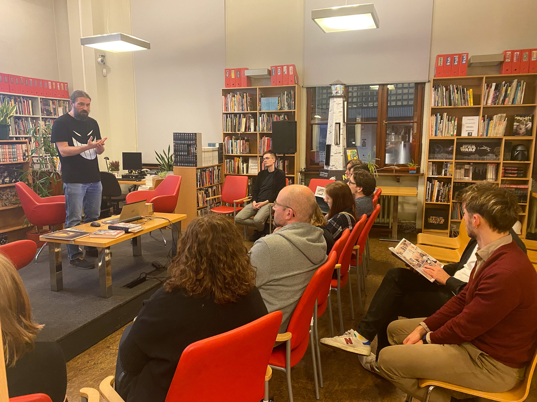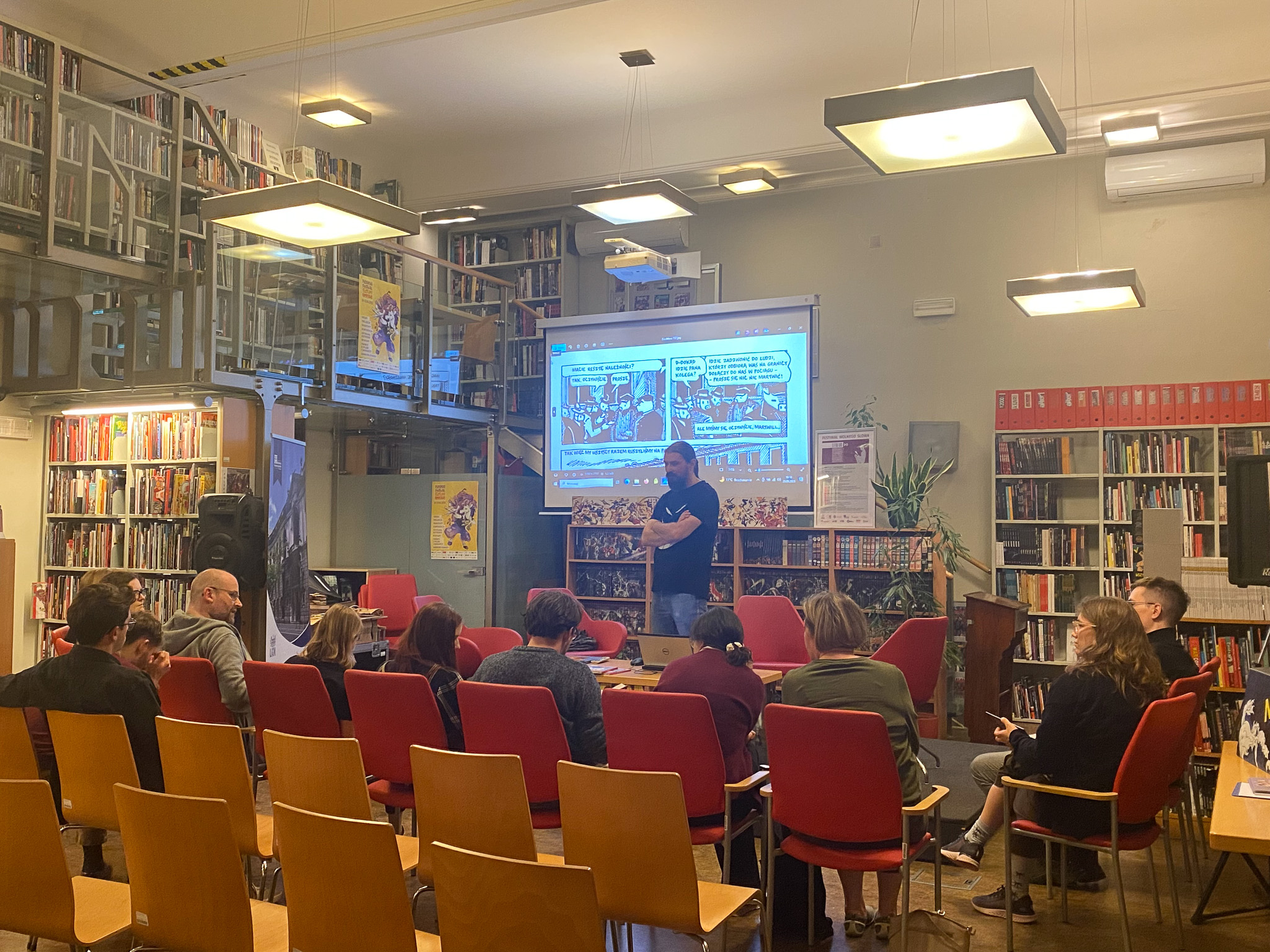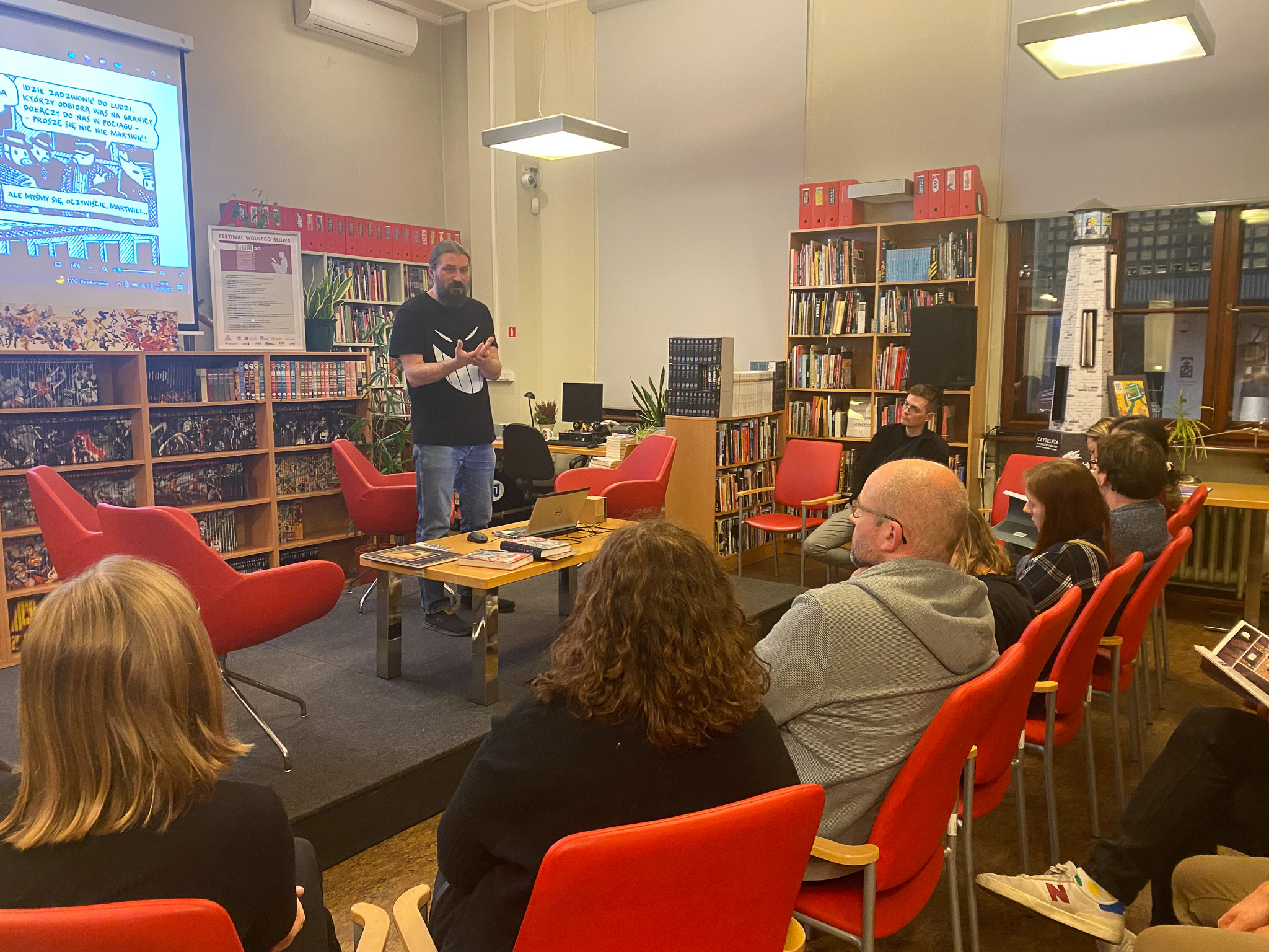 W poniedziałek, 29 września, spotkanie Klubu Książki odbyło się wyjątkowo poza murami Izby. Tym razem uczestnicy odwiedzili Czytelnię NOVA Biblioteki Uniwersyteckiej w Poznaniu, gdzie dr Michał Traczyk, kierownik Pracowni Komiksu, wprowadził ich w fascynujący świat historii obrazkowych.