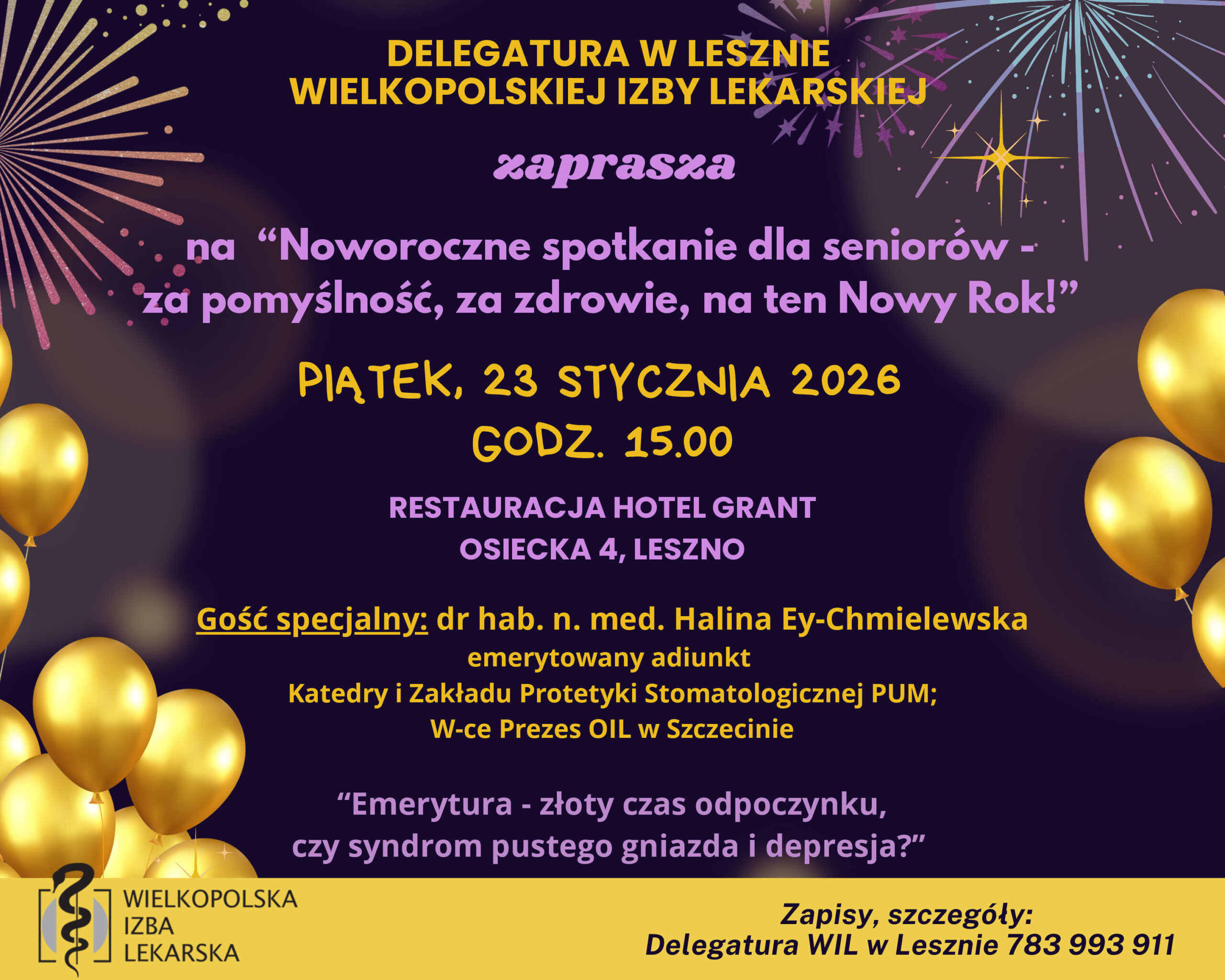 Delegatura Wielkopolskiej Izby Lekarskiej w Lesznie zaprasza na „Noworoczne spotkanie dla seniorów – za pomyślność, za zdrowie, na ten Nowy Rok!”, które odbędzie się w piątek, 23 stycznia 2026 r., o godz. 15.00 w Restauracji Hotel Grant przy ul. Osieckiej 4 w Lesznie.