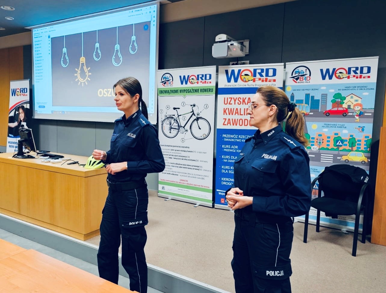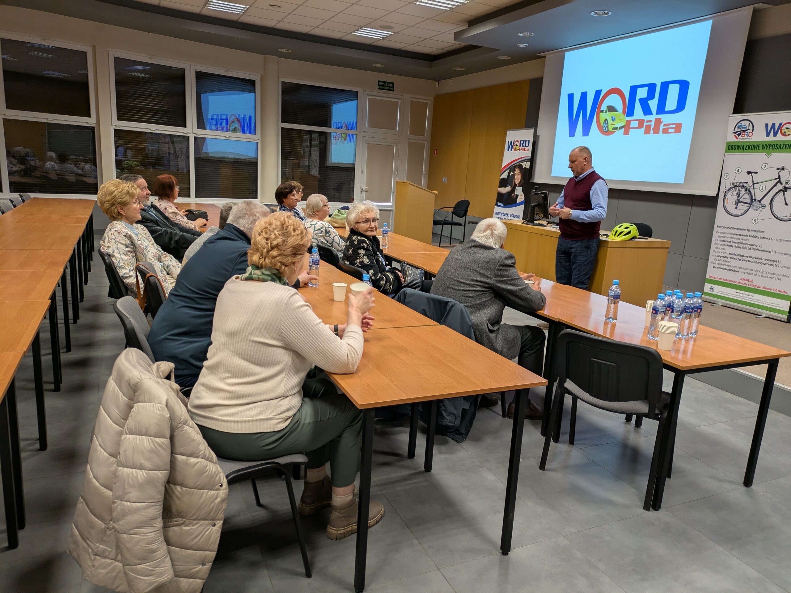 Główną część spotkania poprowadził starszy specjalista Bezpieczeństwa Ruchu Drogowego w Pile z Wojewódzkiego Ośrodka Ruchu Drogowego. W interesujący sposób omówił najważniejsze zasady bezpieczeństwa w ruchu drogowym, podkreślając znaczenie zapinania pasów i odpowiedniego zabezpieczania przewożonych przedmiotów. Uczestnicy mieli okazję zobaczyć działanie symulatora pokazującego wagę osoby lub przedmiotu podczas kolizji – to doświadczenie mocno uwidacznia, jak ważne jest właściwe przygotowanie pojazdu. Dużą uwagę poświęcono także bezpieczeństwu rowerzystów. Omówiono przepisy dotyczące przejazdów dla rowerzystów, skręcania pojazdów, najważniejsze znaki drogowe oraz obowiązki rowerzystów, w tym korzystanie z infrastruktury i sygnalizowanie manewrów.