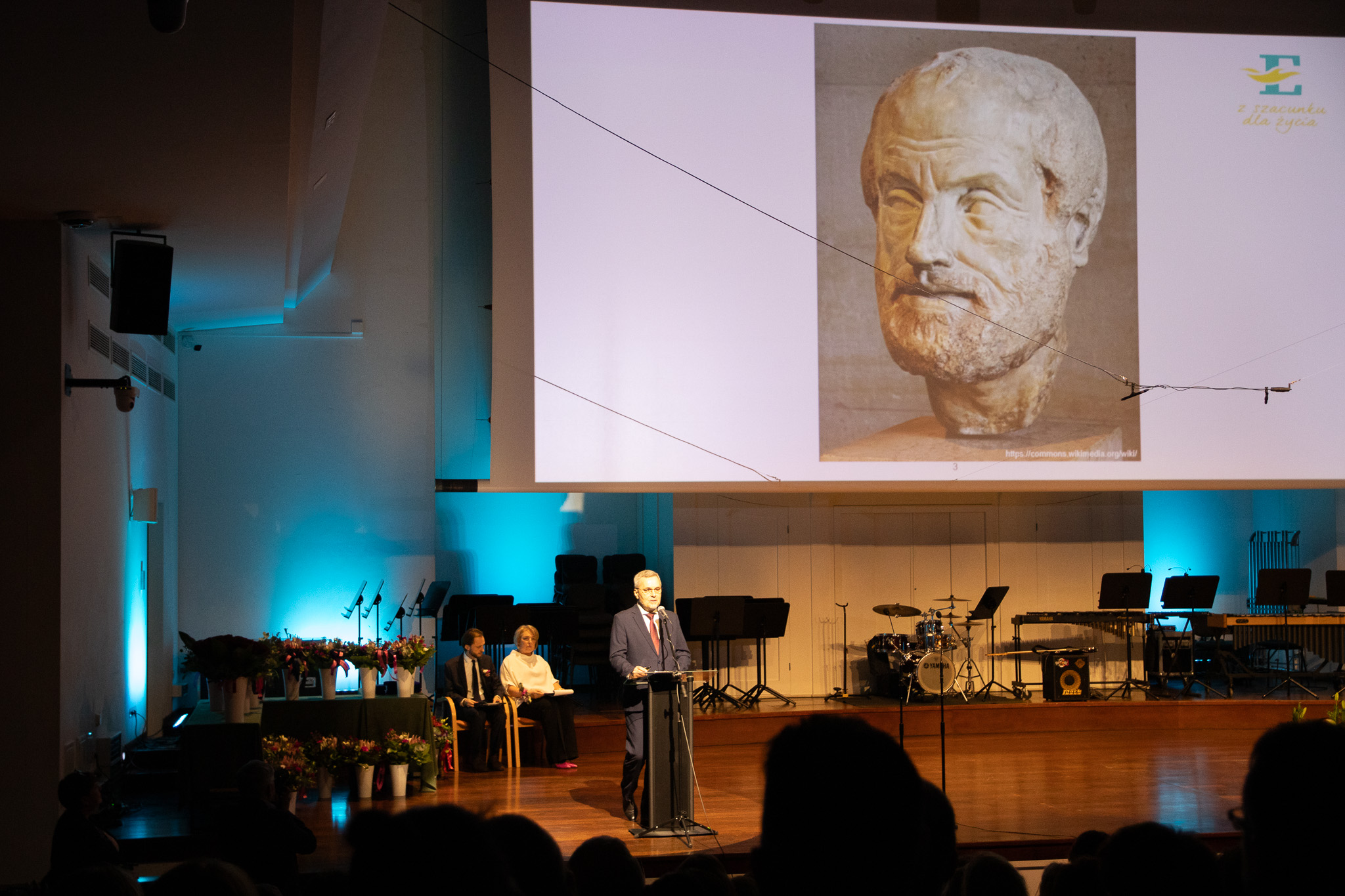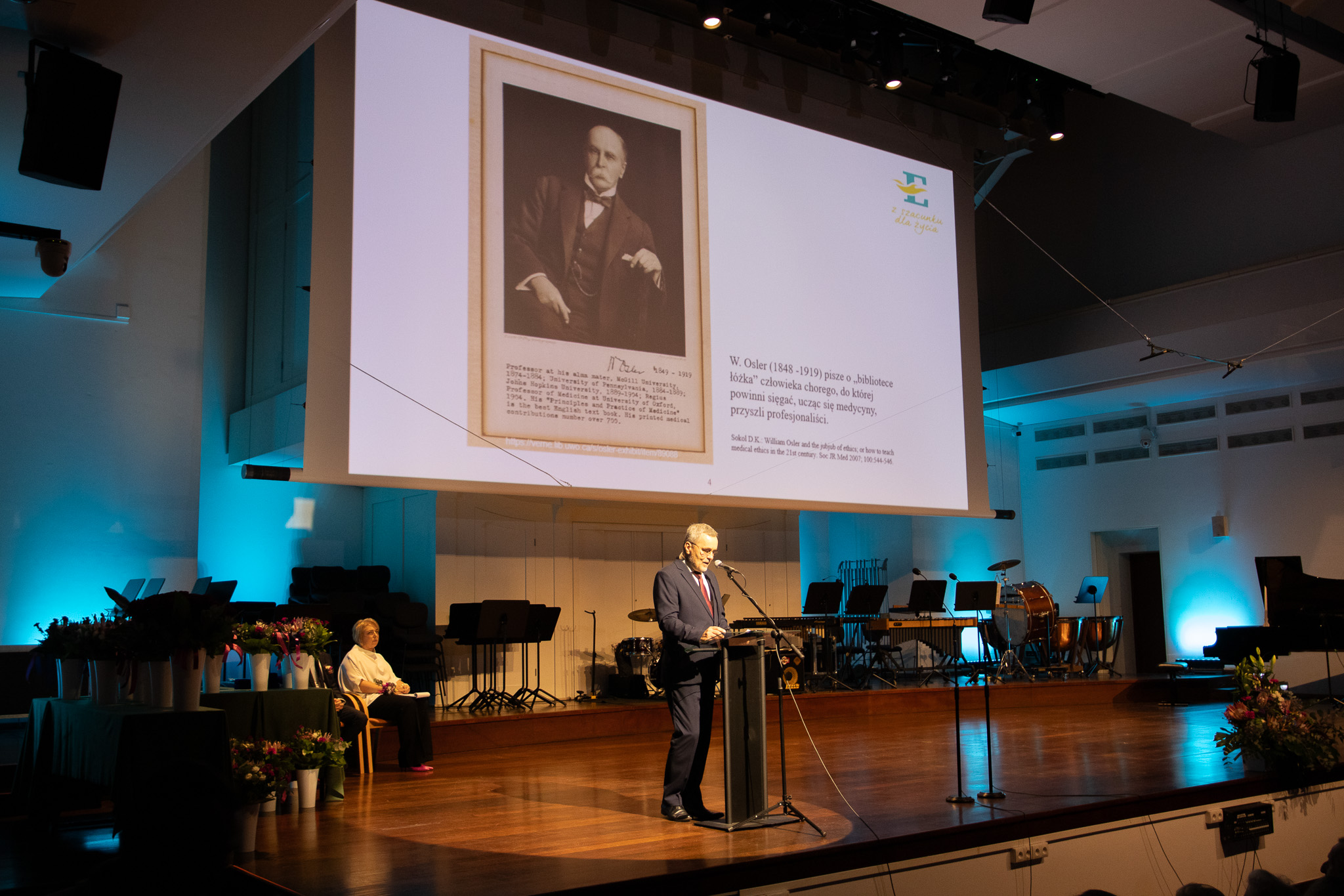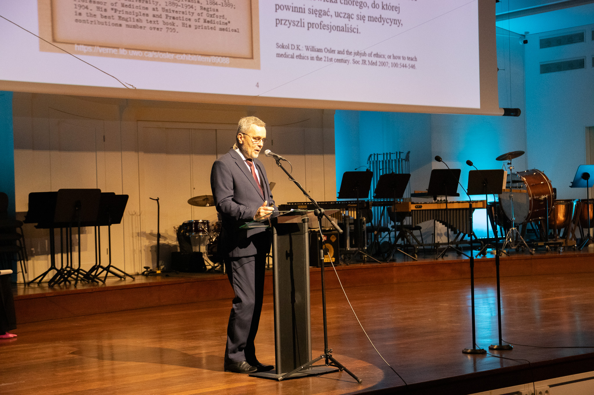 – Studiowanie medycyny może być fascynującą przygodą, poznawaniem nauk medycznych, poznawaniem różnego rodzaju metod diagnostycznych, biologii, człowieka, hodowli tkankowych, objawów, izotopów. To może być  absolutną przygodą życia, ale zarazem może także nie być spotkaniem z człowiekiem, z pacjentem.  Człowieka chorego poznajemy na studiach najpierw jako preparat na stole, a potem jako przypadek potrzebny do zaliczenia jednego czy drugiego przedmiotu. To niekiedy sprawia, ze zatraca się empatię i pacjenta zaczyna się widzieć, jako środek do osiągnięcia pewnego celu – kariery, pieniędzy. Dlatego potrzebny jest nauczyciel, który nie tylko nauczy fachu lekarskiego, ale wskaże też perspektywę patrzenia na ten zawód lekarski. Zwracania uwagi na człowieka, który jest nie tylko przedmiotem, ale jest podmiotem naszym lekarskich działań. Dziś to chyba bardzo trudne zadaniemówił podczas swojego wystąpienia dr med. Paweł Grabowski.