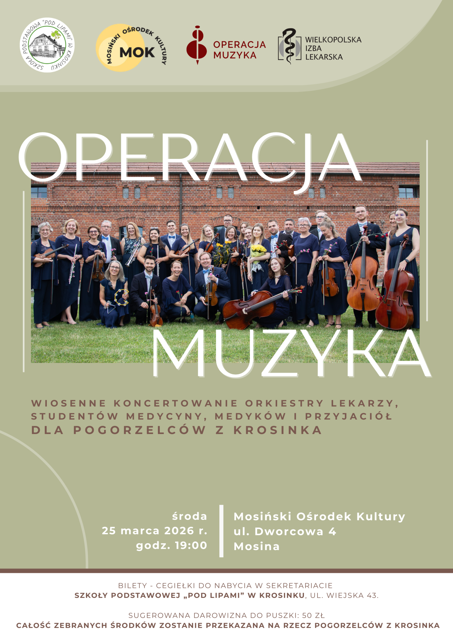 Bilety – cegiełki do nabycia w sekretariacie Szkoły Podstawowej „Pod Lipami” w Krosinku, ul. Wiejska 43.